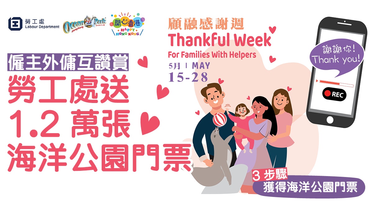 勞工處推出「外傭互讚賞」活動,為表彰僱主與外傭之間的互讚,並提供12000張海洋公園門票獎勵。參加者只需跟從三個簡單步驟:登記成為會員、僱主評價外傭的表現,以及提交參加抽獎活動,於活動期間內即可每日獲得一次抽獎機會,而獲獎者將於五個工作天內收到電郵通知。現在就加入「外傭互讚賞」活動,為僱主與外傭帶來更多獎賞吧!