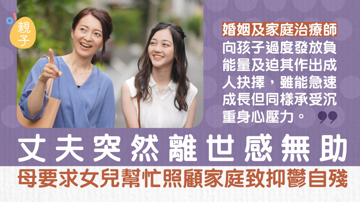對於失去丈夫突然離世的女性,她可能會感到無助與失落,但她必須為了孩子們而勇敢面對這樣的事件,然而,她可能會對孩子們過度發放負能量,使孩子們出現抑鬱、自殘等情況,而對孩子們帶來極大的傷害。