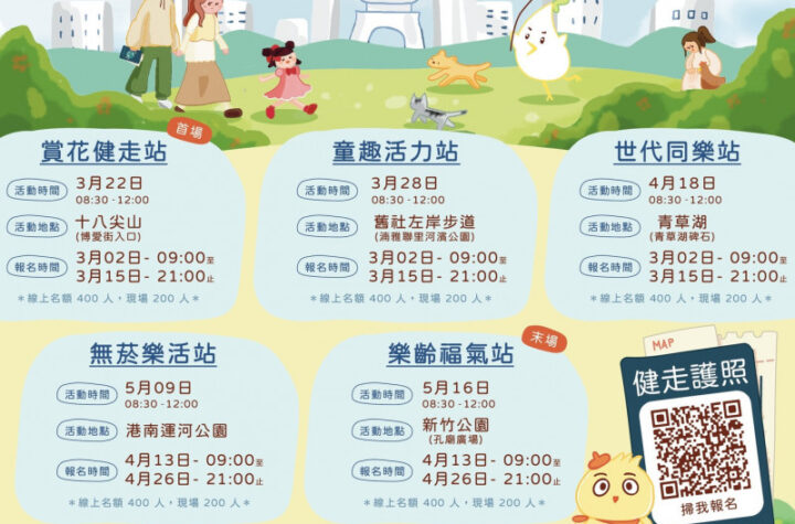 新竹市衛生局推動「風城GO GO 健康夠夠」系列健走活動,結合「健走護照」概念,邀請市民參與,累積健康里程數。首場活動將於22日在十八尖山登場,結合賞花季,市民可走入花海,邁向健康生活。活動共規劃5場次,地點包括十八尖山、舊社左岸步道、青草湖、港南運河公園及孔廟廣場。每場活動皆設主題關卡與章戳,民眾透過「健走護照」集章,完成健康旅程。活動中有好禮相贈,完成指定路線並闖關可獲得禮品及摸彩券,並有機會抽中2000元大獎。集滿護照章戳者可兌換「健走榮耀之星」獎牌。另有健康好禮兌換活動,持竹市健康地圖網上合作店家發票及載具可兌換精美好禮。活動詳情可上粉絲頁及自由健康網查詢。 想知得更多詳情?立即Click這裡 本文章由Open AI人工智能編寫,僅屬學術用途。 可參考相關同類新聞