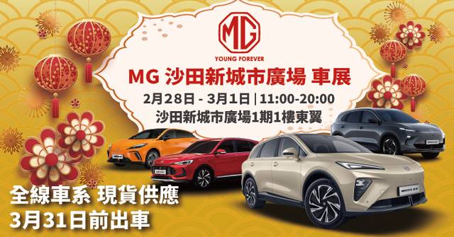 ✨【MG沙田新城市廣場車展│稅務優惠最後召集!最多慳足 $161,880】✨ 本週末,MG將在沙田新城市廣場一期舉辦盛大車展,全線車系現貨供應,即場出車趕及3月31日前盡享稅務優惠,機會難得,不容錯過!🚘 展出焦點車款:🔹全新MGS6 AWD EV豪華旗艦SUV361PS馬力|續航485km|全景天窗|冷暖通風座椅📉現有稅制售價$258,000(新稅制$419,880)慳$161,880🔹MGS5 EV極致操控純電SUVRWD後驅|低重心設計|無線CarPlay|360˚泊車鏡頭📉現有稅制售價$189,000(新稅制$291,540)慳$102,540🔹MG4潮流揭背純電車歐洲銷量冠軍|後驅靈活操控📉現有稅制售價$149,888起 – 免一換一(新稅制$207,500)慳$57,612🔹ZS HEV混能新選擇全球首創3速混合波箱|平均油耗僅4.7L/100km售價$248,000·送首年牌費📍活動詳情🗓日期:2月28日 – 3月1日(週六、日)🕚時間:上午11:00 – 晚上8:00📌地點:沙田新城市廣場一期一樓東翼⚡現貨有限,立即把握最後機會,盡享稅務優惠!*最終售價以海關公布為準│優惠受條款及細則約束│價錢及圖片只供參考。...