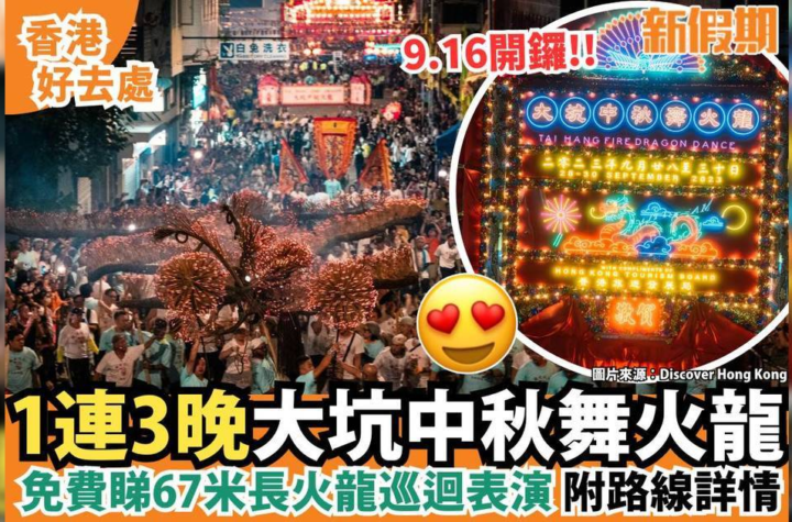 2024年的大坑舞火龍將在中秋節期間舉行,時間是9月16日至18日,為期三天。屆時市民可以免費觀賞這一年一度的舞火龍表演,一同參與”迎月”、”賞月”和”迎月”三大中秋舞龍儀式,近距離欣賞火龍遊行表演!今年的舞火龍路線將延伸至銅鑼灣道,同時在維多利亞公園進行現場直播,讓更多人分享節慶熱鬧氣氛。除了精彩的舞火龍表演,街上還有各種娛樂活動,讓人在中秋佳節中度過一個愉快的時光。記得在這個特別的日子,和家人朋友一起來感受中秋節的獨特魅力,共同歡度這個美好的節日!想知得更多詳情?立即Click這裡 本文章由Open AI人工智能編寫,僅屬學術用途。 可參考相關同類新聞