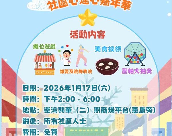 柴灣興華(二)期商場將於2026年1月17日舉辦家社共融社區心連心嘉年華活動。當日節目豐富,包括攤位遊戲、精彩表演、美食換領和壓軸大抽獎等,歡迎所有社區人士參加。活動將帶來熱鬧氣氛,讓家人和朋友一同享受。遊戲券將於現場派發,先到先得,派完即止,建議提早到場。活動詳情可參考etnet經濟通網站。此外,柴灣興華(二)期商場活動也是香港好去處之一,屆時將有各種精彩活動等著大家。欲了解更多詳情,請關注etnet經濟通網站。 想知得更多詳情?立即Click這裡 本文章由Open AI人工智能編寫,僅屬學術用途。 可參考相關同類新聞