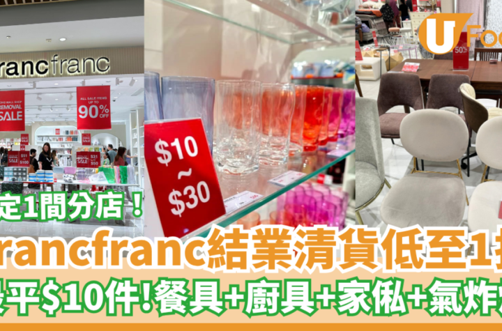 元朗的Franc Franc宣佈將於7月底結業,現在開始進行清貨優惠活動。全場貨品以低至1折的價格出售,僅需$10即可購買,包括多款餐具、廚具、家具、氣炸烤爐等等!每件貨品數量有限,趕快到元朗的Franc Franc店搶購吧!另外,他們的Yoho Mall分店也有類似的優惠,所有貨品低至1折,包括餐具、廚具、家具等等,還有Disney特別版聯乘商品。減價貨品數量有限,售完即止。不要錯過這個結業清貨的好機會!店鋪地址為元龍街9號形點1期2樓2012-2019號舖,營業時間為星期一至日11:00 – 21:00。資料及圖片來源:IG@francfranc_hk_official。【U Lifestyle概不負責】。同場加映:美亞廚具夏日減價優惠,購物滿$400減$20,購物滿$600減$50,還有限時加購優惠。 想知得更多詳情?立即Click這裡 本文章由Open AI人工智能編寫,僅屬學術用途。 可參考相關同類新聞