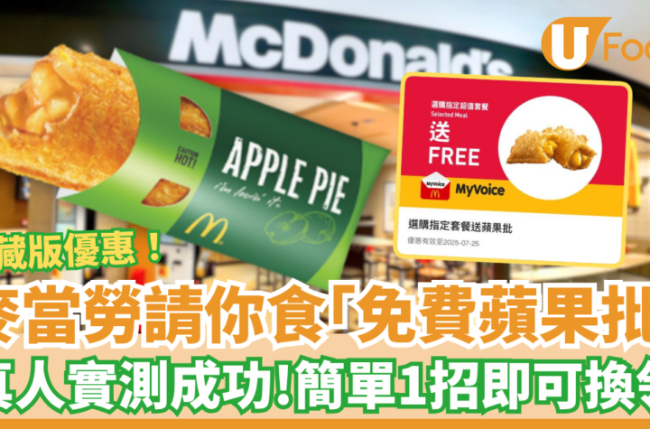 最近,有網友發現了麥當勞的隱藏優惠,只需要使用麥當勞手機應用程式,完成簡單步驟就可以免費換領蘋果批,節省$14升級套餐!想知道更多詳情,請參考以下內容。 一名網友在社交平台分享了在麥當勞用餐時,通過手機App領取「免費蘋果批」的方法。只需打開麥當勞手機App,進入「麥麥聽」頁面,完成問卷調查,就可以獲得免費蘋果批一份,具體步驟如下: 1. 打開麥當勞手機App,點擊右下角的「更多」。 2. 進入「麥麥聽」頁面,點擊「開始問卷」。 3. 輸入最近到訪的麥當勞分店、日期和時間。 4. 完成簡單的意見調查問卷。 5. 進入「優惠」頁面,即可獲取「免費蘋果批」優惠券一張。 小編按照教學成功實測,獲得了免費蘋果批優惠券,可在一星期內兌換。優惠券只適用於指定超值套餐,並有特定使用條款及細則,請仔細閱讀。如有任何爭議,餐廳保留最終決定權。希望各位購物前仔細閱讀使用條款及細則,以免錯失優惠。 想知得更多詳情?立即Click這裡...