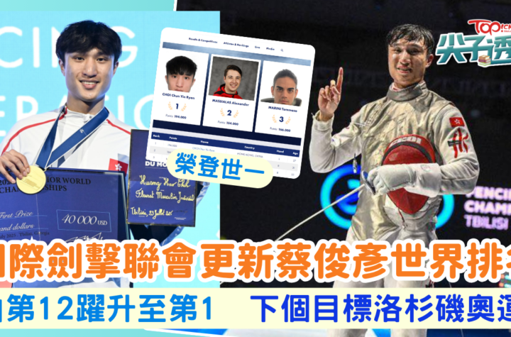 香港代表隊劍擊選手蔡俊彥(Ryan)在昨晚(23日)於格魯吉亞第比利斯舉行的劍擊世界賽中奪得金牌,寫下了香港代表隊的歷史。根據國際劍擊總會(FIE)網站今日(24日)的資料,蔡俊彥目前世界排名第一。他在比賽中展現出色的技術和表現,贏得了眾人的讚譽和尊敬。這次金牌的獲得不僅是對他自己的肯定,也為香港代表隊的形象和實力增添了亮麗的一筆。希望蔡俊彥能夠繼續努力,保持領先地位,為香港的劍擊運動帶來更多榮耀和成就。讓我們一起為他的勝利熱烈祝賀,並期待他在未來的比賽中再創佳績! 想知得更多詳情?立即Click這裡 本文章由Open AI人工智能編寫,僅屬學術用途。 可參考相關同類新聞